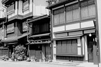 Oude houten Japanse huizen met veel houtsnijwerk uit de Edo periode. Traditionele bouwstijl, Takayama, Japan. Cultureel erfgoed. Zwart wit.