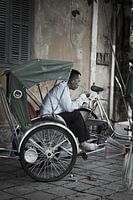 Fietsriksja rijder in Hoi An in Vietnam neemt een pauze en luncht in zijn riksja