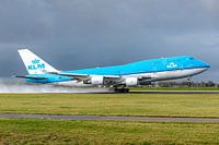 Deze KLM Boeing 747-400 stijgt op vanaf een natte Polderbaan van luchthaven Schiphol.