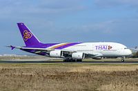Een Airbus A380-800 van Thai Airways International vertrekt vanaf de luchthaven van Frankfurt am Main.
