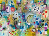 Een print van origineel schilderij 'Taking Shape', acrylverf op canvas 60x80cm. Dit schilderij is een loskomen van speelsheid uit een volwassen keurslijf. Met nog enigszins gedempte kleuren, een eerste stap in het loslaten van voorschriften. Een herboren kinderlijkheid, die er in al zijn dynamiek mag zijn.