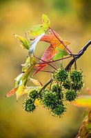 Close up van een takje van een amberboom (liquidambar styraciflua) met stekelige groene vruchtballetjes en rode en groene stervormige bladeren