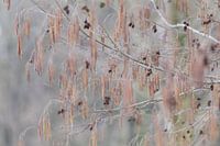 Een prachtig wintersilhouet van de takken van de zwarte Els. Vol met mannelijk katjes en oude zwart-bruine vruchten (elzenproppen)