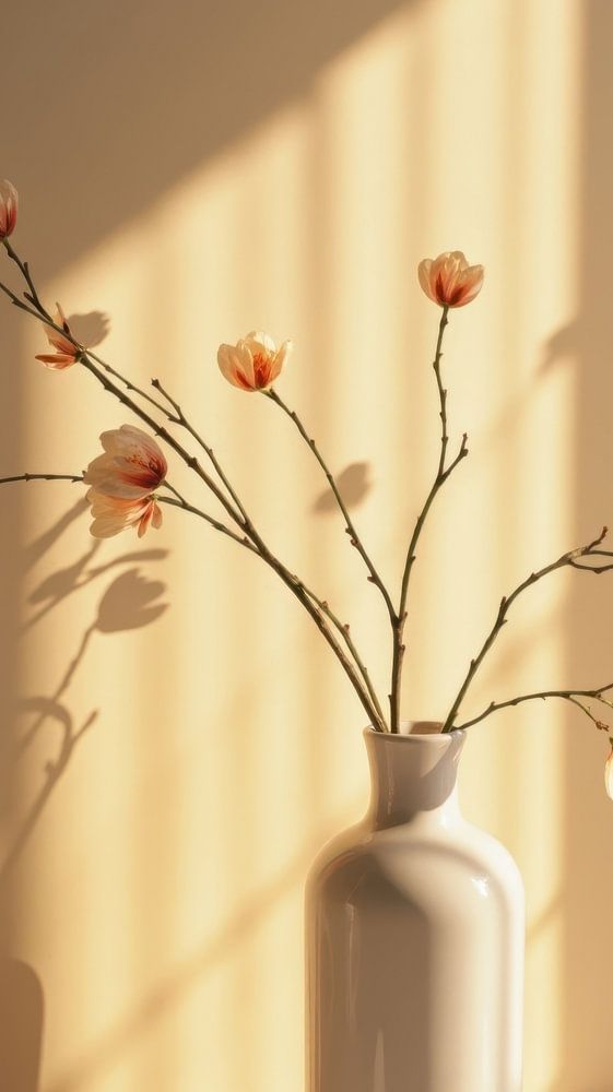 Takken van perzikbloesem in witte vaas die schaduwen werpen in warm zonlicht