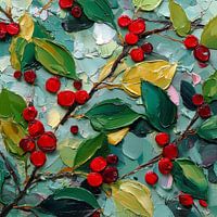 Levendige en speelse compositie van takken, bladeren en bessen, opgebouwd uit dikke, expressieve verfstreken. De bladeren zijn uitgevoerd in een rijk palet van groentinten, variërend van fris limegroen tot diep donkergroen, aangevuld met accenten van warm geel. De felrode bessen vormen krachtige kleurpunten die direct de aandacht…