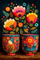 Een levendig stilleven met twee rijkelijk versierde keramische bekers geïnspireerd door Talavera volkskunst, Talavera is een ambachtelijke, handbeschilderd en geglazuurd aardewerk uit Mexico, met diepe wortels in de Spaans-koloniale traditie. Het wordt gekenmerkt door levendige kleuren en ingewikkelde patronen, vaak gebruikt voor…