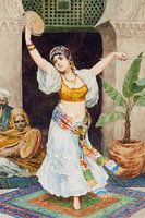 Een plaatje uit de Oriënt, Perzië of Arabië (het Midden Oosten of Noord Afrika). Een Arabische vrouw staat op het portret en één danst vrolijk met een tamboerijn, terwijl twee Arabieren, muzikanten, de bijbehorende muziek maken. Allen zijn ze in traditioneel oosters tenue.