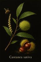Een botanische illustratie van de tamme kastanje (Castanea sativa), uitgevoerd in de karakteristieke stijl van Herbarium Lux.