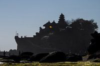 Tegenlichtfoto van Pura Tanah Lot, tempel aan de kust van West Bali. De zon verlicht nog net een van de parasols (tedung)