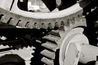 Tandwielen op een historische kraan in de voormalige handelshaven van Maagdenburg. Tegenwoordig dient de technische uitrusting van de havenfaciliteit alleen nog als tentoonstellingsobject.
