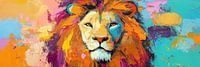 Tangerine Leeuw - Op dit schilderij zie je een grote, krachtige leeuw met een opvallende oranje manen en een sterke, indringende blik, allemaal uitgevoerd in heldere kleuren en een abstracte stijl die het geheel levendig maakt.