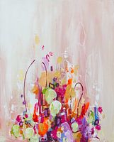 Dit bruisende zonnige schilderij is zonder plan vooraf ontstaan. Ik schilder deze stijl intuïtief en elke keer weer ontstaat er dan een beeld van geabstraheerde bloemen. Het zíjn niet echt bloemen, maar ze doen er onmiskenbaar aan denken. Zijn het de vrolijke kleuren en de levendige vormen die je tegemoet spatten?
