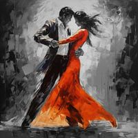 Het tango dansers Color Splash schilderij is een expressief kunstwerk dat de passie, energie en elegantie van de Argentijnse tango op indrukwekkende wijze vastlegt. Deze fotoprint toont een dansend paar in een krachtige pose, waarbij hun bewegingen bevroren lijken in de tijd. De danser is subtiel weergegeven in zwart-wit, terwijl de jurk van de vrouw wordt afgebeeld in levendige rode en oranje kleuren. Dit krachtige contrast zorgt voor een dynamisch en meeslepend effect dat het schilderij tot leven brengt.