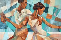De afbeelding toont een tafereel van een danskoppel dat de tango danst, afgebeeld in een abstracte en geometrische stijl die doet denken aan kubisme.