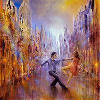 Een koppel in uitbundige levensvreugde in een grote stad met een skyline als silhoutte. Goed humeur, goede geesten, dansen op straat. Misschien tango?