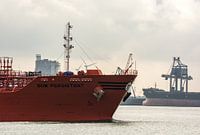 Tanker verlaat de haven van Rotterdam naar een bestemming op zee. Een zeeman op de boeg kijkt nog naar een ander schip aan de Europort.