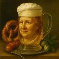 Tante Bräu kijkt je vriendelijk aan vanuit een klassieke bierpul met een schuimkraag als kapsel. Rondom haar liggen een worst, een pretzel en hop – alsof je zo kunt aanschuiven. Dit portret combineert Beierse gastvrijheid met barokke schilderkunst en een flinke dosis humor.