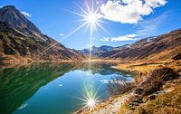 Een fantastische reflectie met de zonnestralen en de bergen.