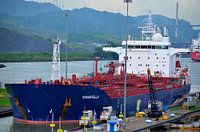 De olie- en chemicaliëntanker Tarantella, varend onder de vlag van Liberia, is op 20 juli 2013 gefotografeerd in het Panamakanaal.