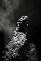 Een majestueuze blikvanger trekt de aandacht met dramatisch licht en schaduw. De sculpturale houding van het reptiel, majestueus neergestreken op een rots, brengt de scène tot leven. Dit betoverende kunstwerk is perfect voor een woonkamer of thuiskantoor om creativiteit en inspiratie aan te moedigen.