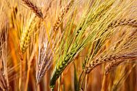 De zon schijnt in een akker met tarwe halmen. De verschillende kleuren zorgen voor een levendig beeld.