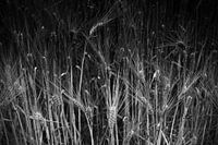 Een graanveld is ongeveer klaar om geoogst te worden. Dit is een zwart-wit foto.
