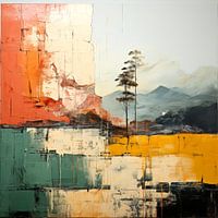 De gedurfde kleuren - geel, oranje, rood, lichtblauw, donkerblauw, gebroken wit en turquoise - voegen diepte toe aan het kunstwerk en brengen tegelijkertijd de illusie tot leven. Door de zorgvuldige plaatsing van de verf lijkt het alsof je door een abstracte wereld naar de werkelijkheid van een boom kijkt.