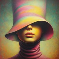 Deze mysterieuze figuur verdwijnt bijna volledig onder een grote regenboogkleurige hoed. Alleen volle lippen zijn zichtbaar. Een kleurrijk en speels modeportret met een knipoog naar anonimiteit.