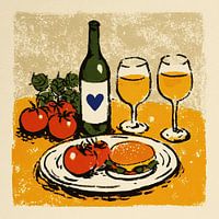 Tasty Moments on a Plate - Dit restaurant schilderij toont een smakelijke hamburger met verse tomaten en een groene salade, omringd door twee glazen witte wijn en een groene wijnfles met een hartje op het label, wat een gezellige en uitnodigende sfeer oproept.
