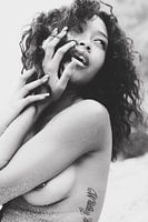 Dit naaktmodel kijkt verrast achterom terwijl ze haar boezem bedekt met haar armen. Op de zij is van het model nog net een stuk tatoeage te lezen.
