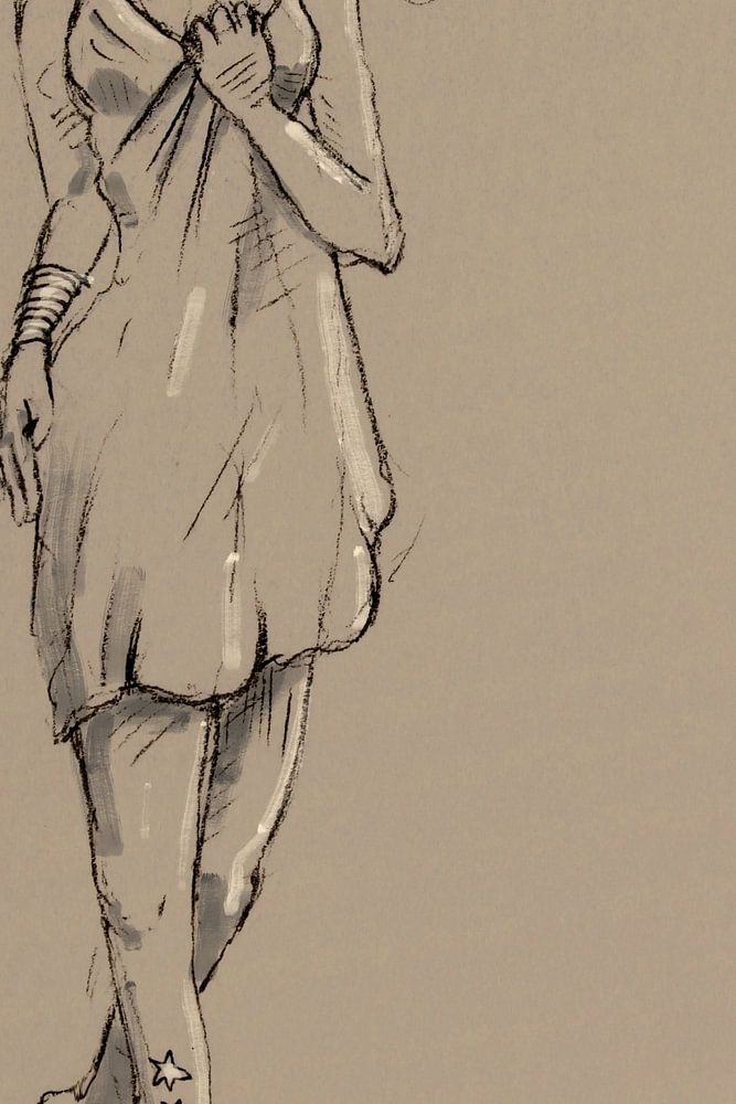 Prachtige taupe kleurige potlood schets van een vrouw in een nacht japon. Deze vrouw heeft een tattoo met drie sterren op haar been. Ze heeft prachtige krullende haren. Met digitale penseelstreken zijn hooglichten en schaduwen toegevoegd. Dit werk past heel goed in een interieur met natuurlijke kleuren, zoals hout, of andere beige of crème tinten.