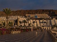 Gezicht op de lege waterkant van het vakantiedorp Taurito in het avondlicht aan de zuidkust van het eiland Gran Canaria, Canarische Eilanden, Spanje met palmbomen en grote hotels op de hellingen van de rotsachtige bergen.