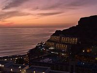 Prachtig uitzicht over het vakantiedorp Taurito aan de zuidkust van het eiland Gran Canaria, Canarische Eilanden, Spanje na zonsondergang met een verlicht hotel, de silhouetten van rotsachtige rotsen en kleurrijke lucht met wolken.