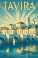Deze poster van Tavira portretteert de charme van een van de meest pittoreske stadjes van de Algarve door middel van een gedurfd Art Deco ontwerp. De iconische Romeinse brug strekt zich sierlijk uit over de kalme rivier en weerspiegelt de witgekalkte huizen en terracotta daken van het stadje. Stralen van gouden zonlicht stromen door de lucht en verlichten de elegante kerktorens en tijdloze architectuur van Tavira. Tavira staat bekend om zijn serene sfeer, geplaveide straten en lagunelandschappen. Het combineert historische charme met natuurlijke schoonheid, waardoor het een verborgen juweeltje in Portugal is. Dit kunstwerk legt die rustige essentie vast terwijl het het warme zuidelijke licht viert. Of je je nu aangetrokken voelt tot de Portugese geschiedenis, de mediterrane cultuur of gewoon van karaktervolle kustplaatsen houdt, dit Tavira muurkunstwerk brengt je elke dag naar de Algarve. Het is een perfect decoratiestuk voor woonkamers, studeerkamers of creatieve ruimtes en combineert nostalgie van vintage reizen met hedendaagse elegantie.