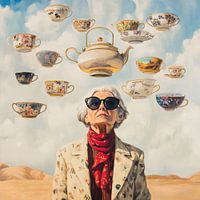 In dit eigenzinnige kunstwerk lijkt de zwaartekracht even vakantie te hebben. Tea Defies Gravity toont een oudere vrouw met een opvallende rode sjaal, zwarte zonnebril en een jas vol bloempatronen. Boven haar hoofd zweven een gouden theepot en een bonte collectie porseleinen theekopjes in de lucht – elk met een uniek bloemenmotief.
