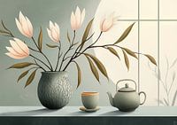Tea and Blooms - Dit bloemen schilderij toont een Japandi stilleven met magnolia‑achtige zachtroze bloemen in een gebarsten keramieken vaas naast een matte groene theepot en kopje op een vensterbank met zacht ochtendlicht, een strak en modern stilleven perfect als bloemen schilderij of schilderij bloemen voor een modern…