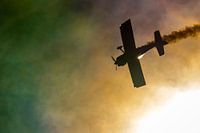 Het Engelse demonstratieteam van Team Raven vliegt voor de zon langs op Sanicole in België.