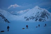 Teamwork op de Denali. Vier bergbeklimmers lopen over de Kahiltna gletsjer bij Denali in Alaska. Op de achtergrond is Mount Hunter. Ze lopen op sneeuwschoenen en trekken een slee met materiaal voort.