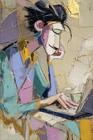 Techie Vibes - Dit moderne schilderij toont een man die geconcentreerd achter een laptop zit, met een opvallend gebruik van verschillende kleuren en een dynamische compositie die de kunststijl van het doek benadrukt.