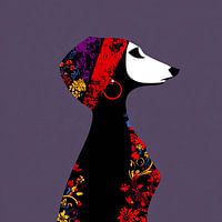 De combinatie van traditionele en moderne elementen maakt dit werk uniek en aantrekkelijk. Perfect voor liefhebbers van mode en honden, dit stuk zal elke ruimte een vleugje stijl en verfijning geven.