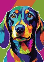 Met zijn nieuwsgierige uitdrukking en kenmerkende lange oren straalt dit pop-art teckelportret met elektriserende groenblauwe, gele en magenta kleuren. De gestileerde patronen en felle kleuren vieren de loyale, beminnelijke aard van het ras, waardoor het een perfecte toevoeging is aan moderne huizen die op zoek zijn naar een vrolijke, artistieke touch.
