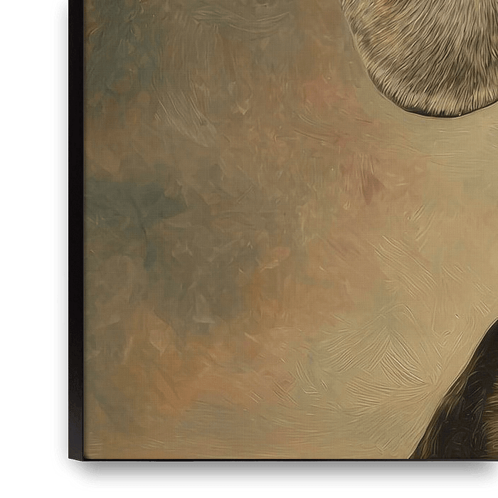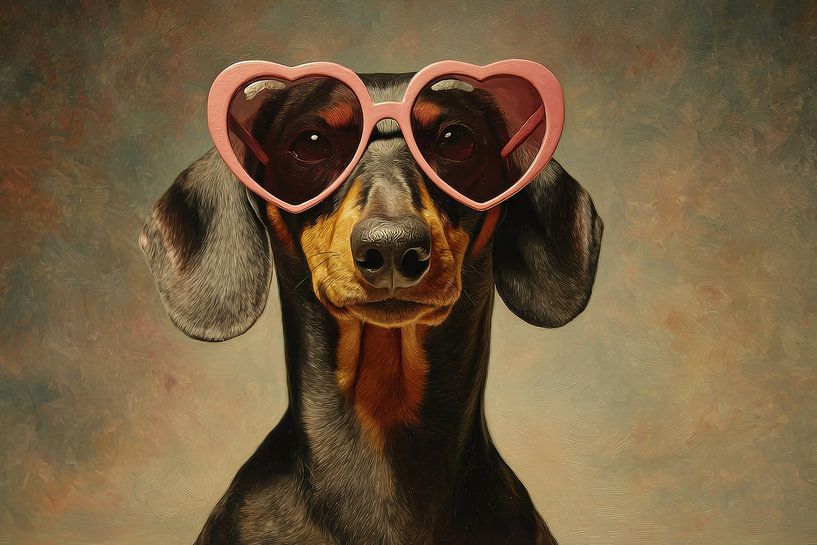 Deze elegante teckel kijkt recht vooruit met een rustige, bijna zelfverzekerde blik, terwijl een opvallende roze hartvormige bril zijn gezicht een speelse uitstraling geeft. De donkere glazen vangen subtiel het licht en laten zijn nieuwsgierige ogen zacht doorschemeren. Tegen de warme, schilderachtige achtergrond komen de diepe…