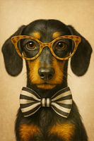 Een charmante teckel in vintage stijl, gehuld in een oversized zwart-wit gestreepte strik en een bril met schildpadmotief. Zijn serieuze blik contrasteert heerlijk met de speelse accessoires. Deze illustratie combineert klassieke portretkunst met een knipoog en is een echte blikvanger aan je muur. Perfect voor hondenliefhebbers,…