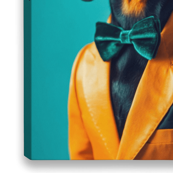 Een elegante teckel in een felgeel pak straalt charme en zelfvertrouwen uit. Met zijn glanzende vacht en ondeugende blik lijkt hij klaar voor de rode loper. De groene strik rondt zijn chique look af en voegt een vleugje extravagantie toe. Een echte VIP onder de viervoeters!