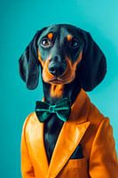 Een elegante teckel in een felgeel pak straalt charme en zelfvertrouwen uit. Met zijn glanzende vacht en ondeugende blik lijkt hij klaar voor de rode loper. De groene strik rondt zijn chique look af en voegt een vleugje extravagantie toe. Een echte VIP onder de viervoeters!