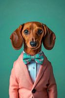 Stijlvol en charmant staat deze teckel in een elegant, roze gekleurd pak, aangevuld met een vrolijk strikje. Met zijn grote, expressieve ogen en lange oren straalt hij een zelfverzekerd karakter uit. Een beetje dandy, een beetje onschuldig - klaar om elke kamer op te fleuren met zijn unieke persoonlijkheid.