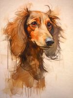 Een hond met expressieve ogen zit sierlijk en straalt zachte elegantie uit. De kunstenaar legt de lange, vloeiende oren en gladde vacht van de hond vast met vloeiende, dynamische lijnen en warme tinten.