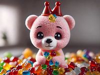 Dit kunstwerk toont een teddybeer. Niet zomaar een speelkameraad, maar een die verhalen vertelt zonder woorden. De tedere blik en de zachte textuur suggereren een vriendelijkheid die comfort en nostalgie oproept. De kroon, speels en koninklijk, voegt een element van fantasie toe en de gummyberen in zijn armen symboliseren de onschuldige…