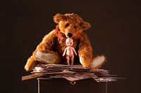 Horizontale foto, Clair obscur, van een klassieke Teddybeer met een klein naakt poppetje op een stapel oude foto’s.