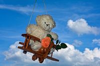 Een witte teddybeer zit in een vliegtuig, met een blauwe lucht en wolken...